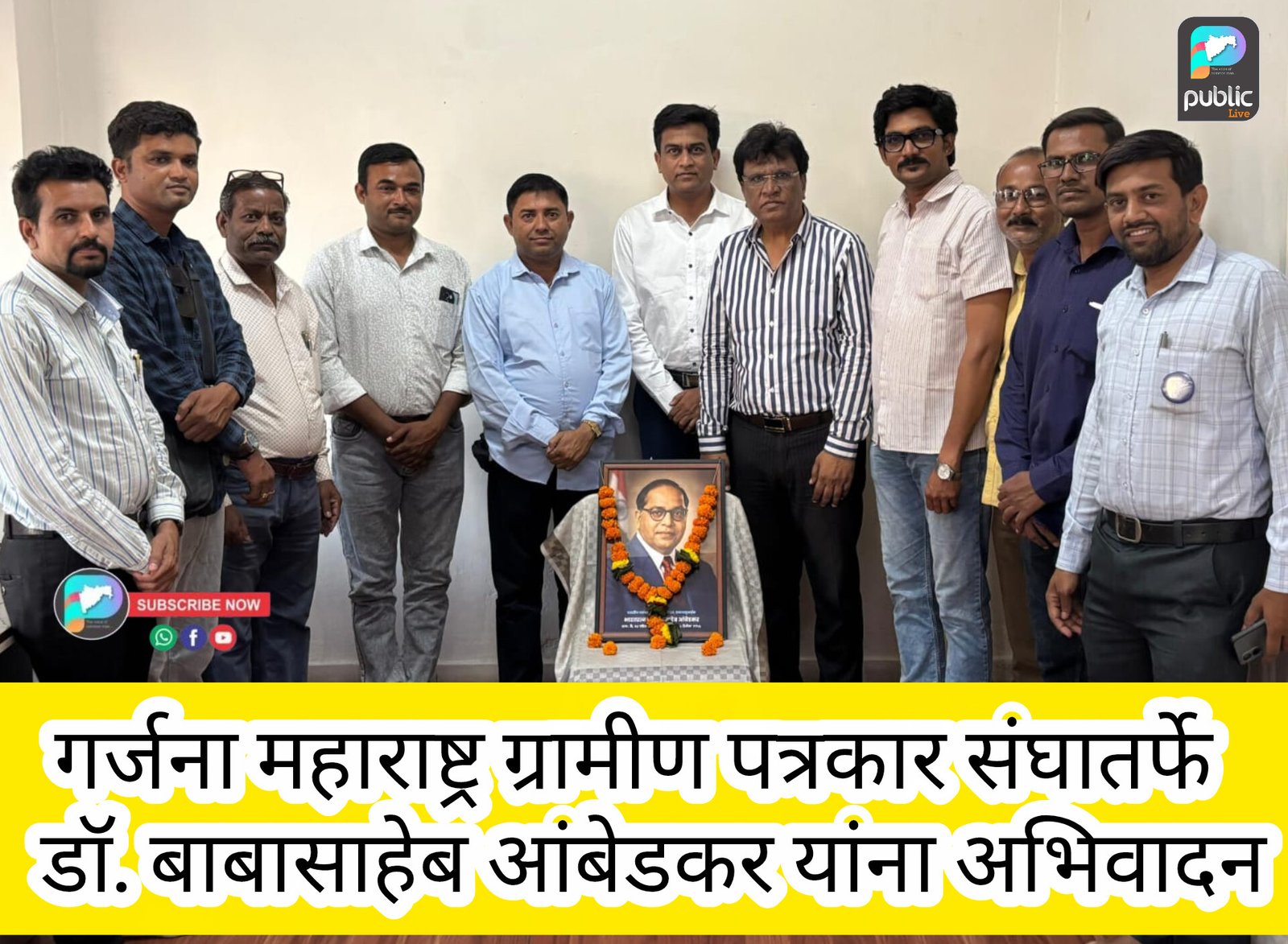 जळगाव: भारतरत्न डॉ. बाबासाहेब आंबेडकर यांच्या १३५ व्या जयंतीनिमित्त गर्जना महाराष्ट्र ग्रामीण पत्रकार संघाच्या वतीने जळगावात अभिवादन कार्यक्रमाचे आयोजन करण्यात आले होते. यावेळी महामानवाच्या प्रतिमेला पुष्पहार अर्पण करून त्यांच्या गौरवशाली कार्याचे स्मरण करण्यात आले.