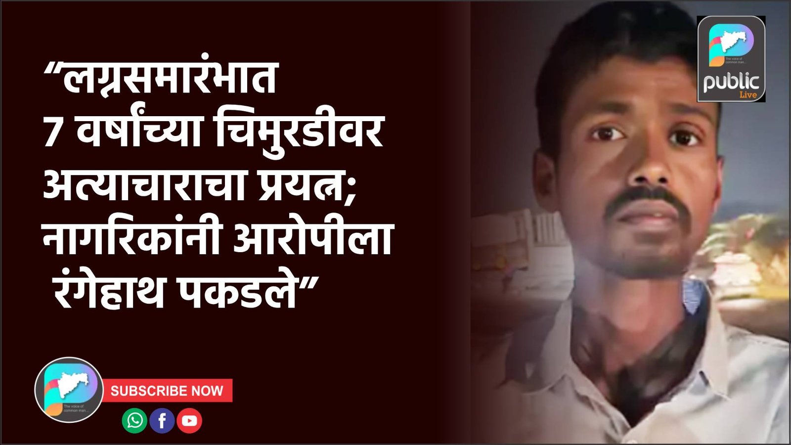 कोल्हापूर जिल्ह्यात लग्नसमारंभातून अवघ्या सात वर्षांच्या चिमुरडीवर अत्याचाराचा प्रयत्न झाल्याची धक्कादायक घटना समोर आली आहे. पीडित मुलगी आईसोबत नातेवाईकांच्या लग्नाला आली असताना 28 वर्षीय विकास कांबळे या युवकाने तिच्यावर अत्याचाराचा प्रयत्न केल्याची माहिती समोर आली. मुलीच्या वेळीच दिलेल्या आरडाओरड्याने आणि उपस्थित नागरिकांनी तत्काळ धाव घेतल्याने मोठा अनर्थ टळला.