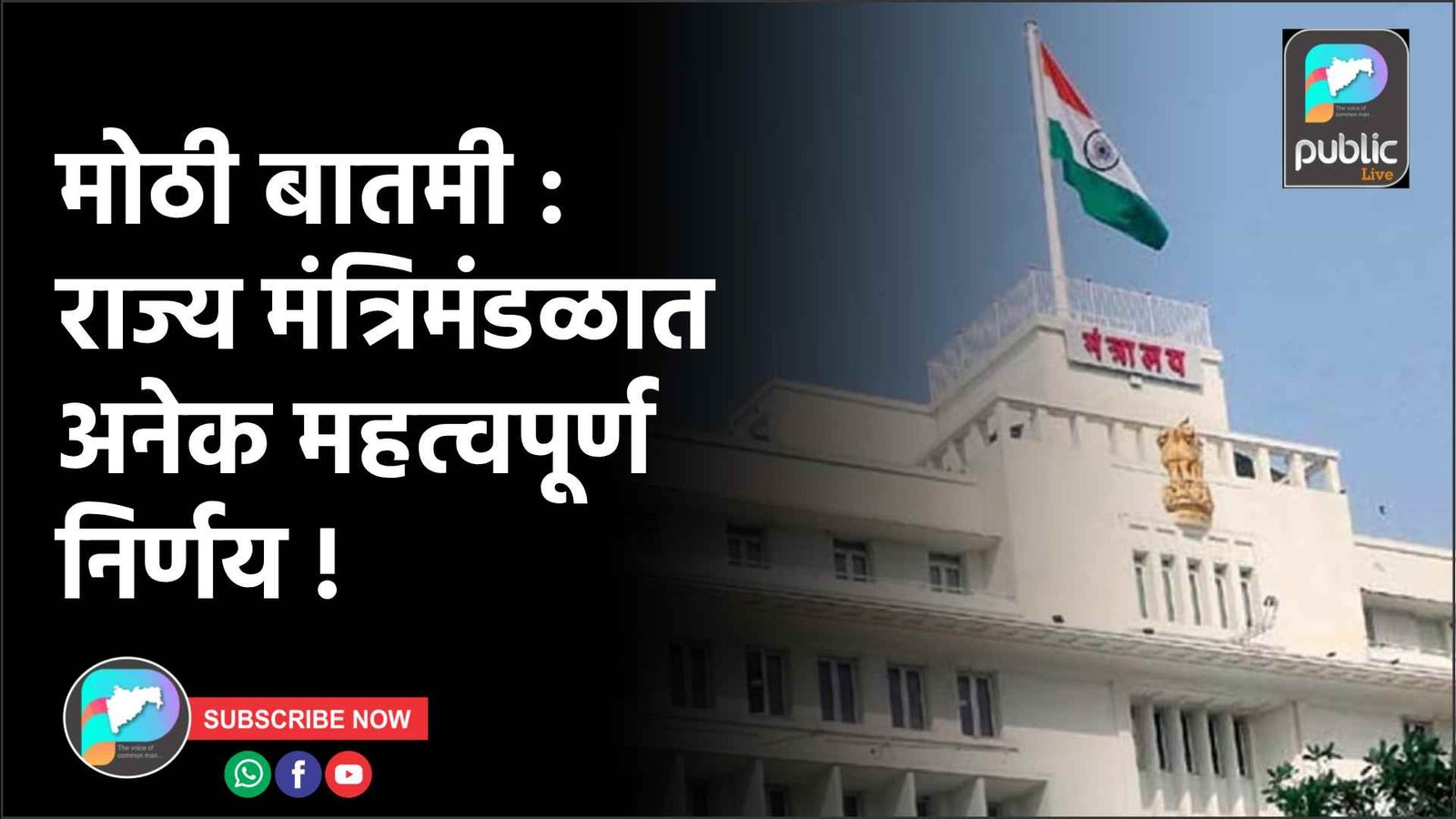 राज्यातील महायुती सरकार अनेक महत्वपूर्ण निर्णय घेत असतांना आज मुख्यमंत्री फडणवीस यांंच्या अध्यक्षतेखाली राज्य मंत्रिमंडळाची बैठक आज (26 ऑगस्ट 2025) संपन्न झाली. या बैठकीत मोठे निर्णय घेण्यात आले असून शेती, सहकार, कामगार कल्याण, आणि पायाभूत सुविधांना चालना मिळणार आहे. बीड जिल्ह्यातील बंधाऱ्यांचे बॅरेजमध्ये रूपांतर, कामगार कायद्यांत सुधारणा, सहकारी साखर कारखान्यांना आर्थिक मदत, आणि नागपूर-गोंदिया द्रुतगती महामार्गासारखे प्रकल्प यामुळे विकासाला गती मिळेल. यासोबतच, विमुक्त जाती आणि भटक्या जमातींसाठी नव्या योजना आणि न्यायिक सुधारणांनाही मंजुरी देण्यात आली आहे.