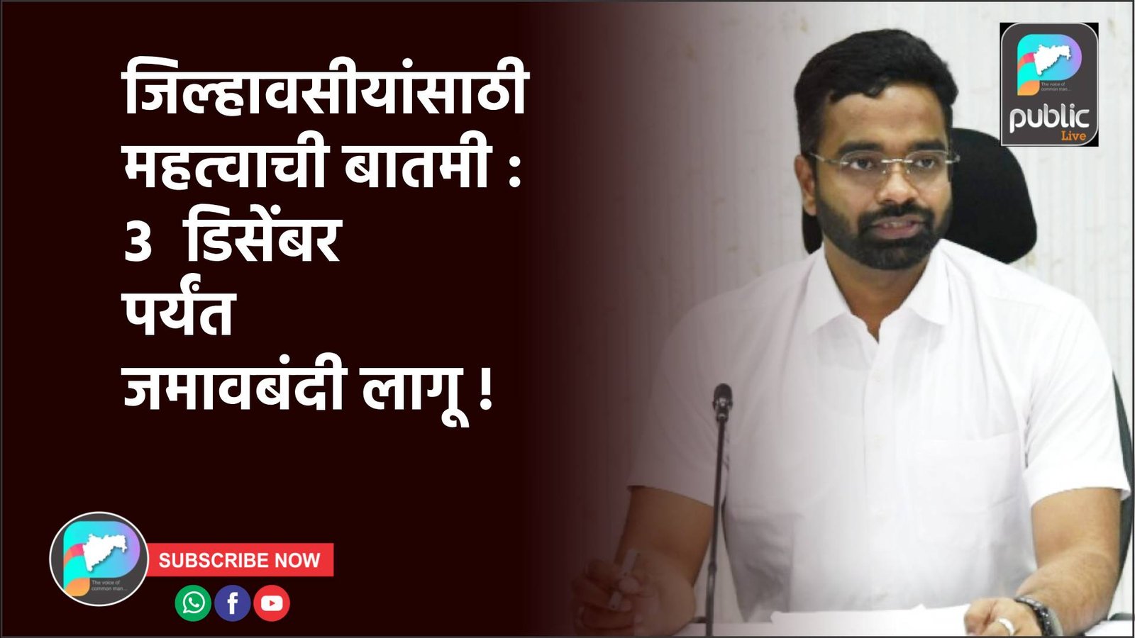 जळगाव जिल्ह्यात नगर परिषद / नगरपंचायत सार्वत्रिक निवडणुकीच्या पार्श्वभूमीवर जिल्हाधिकारी व जिल्हा निवडणूक अधिकारी रोहन घुगे यांनी कायदा व सुव्यवस्था अबाधित राखण्यासाठी सोमवार, 1 डिसेंबर रात्री 10.05 वाजेपासून तर मंगळवार, 3 डिसेंबर रोजी रात्री 12 वाजेपर्यंत भारतीय नागरी सुरक्षा संहिता 2023 मधील कलम 163 (2) नुसार जमावबंदीचे आदेश लागू केले आहेत.