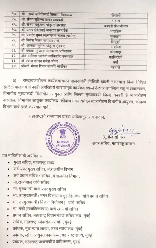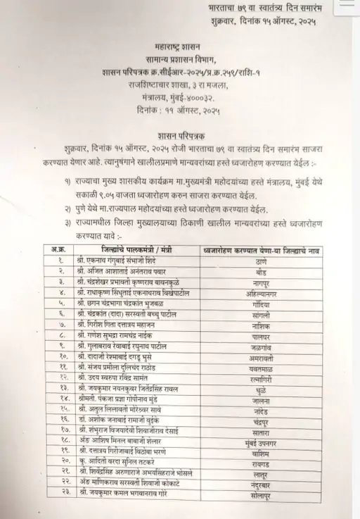पालकमंत्री पदाचा वाद सुरू असतानाच आता आता रायगडमध्ये 15 ऑगस्ट रोजी अदिती तटकरे तर नाशिकमध्ये गिरीश महाजन ध्वजारोहण करणार असल्याचे जाहीर झाले आहे. राज्याच्या सामान्य प्रशासन विभागाने कोणत्या जिल्ह्यात कोण ध्वजारोहण करणार याची यादी जाहीर केली आहे. त्यानुसार रायगडमध्ये अदिती तटकरे तर नाशिकमध्ये गिरीश महाजन हेच ध्वजारोहण करणार आहेत.