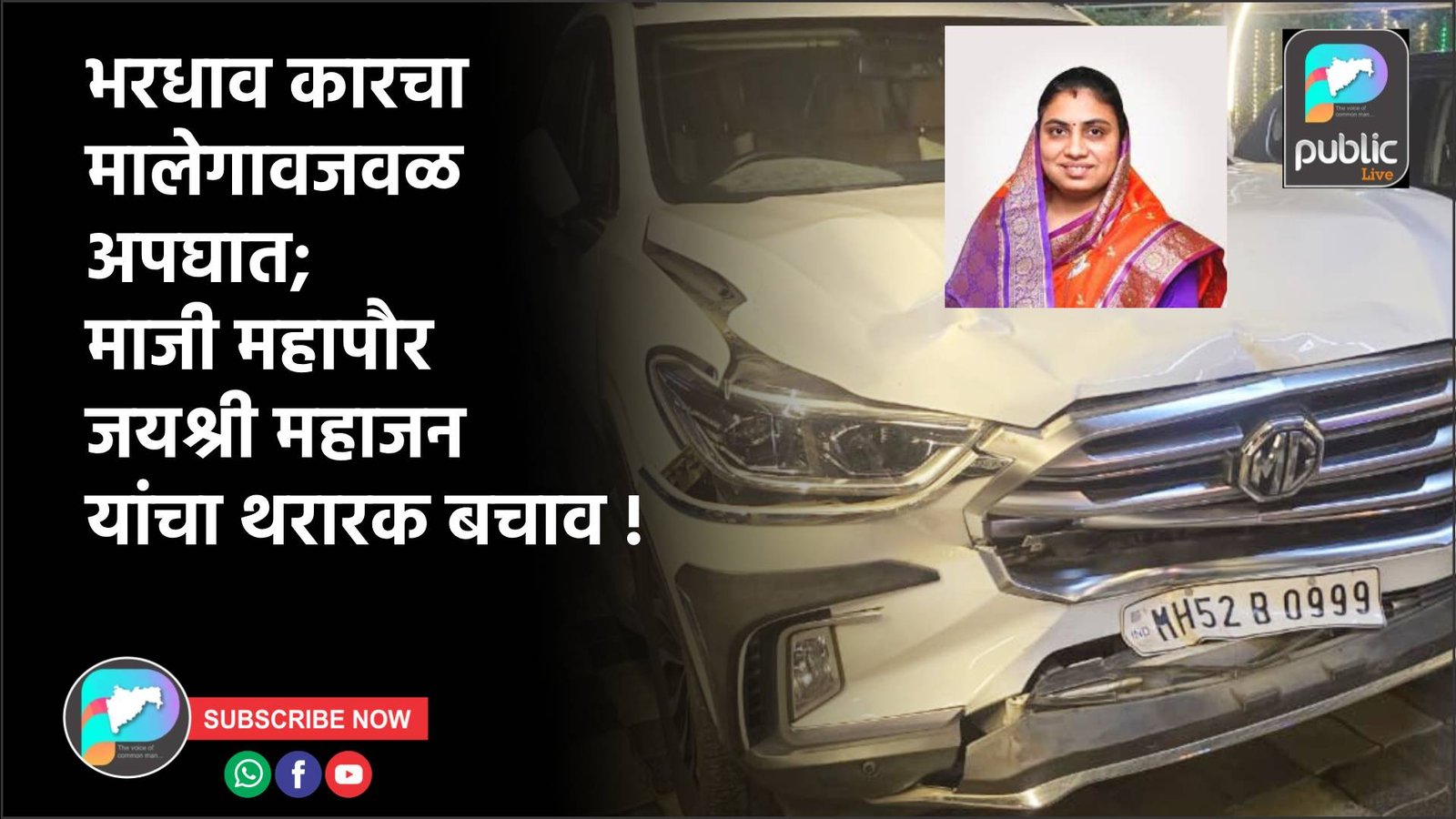 अपघाताच्या वेळी कारमधील सर्व प्रवासी सीट बेल्ट लावलेले असल्याने मोठा अनर्थ टळला. मात्र या धडकेत कारच्या दर्शनी भागाचा अक्षरशः चुराडा झाला. कारमध्ये जयश्री महाजन, सुनील महाजन यांच्यासह विनोद मराठे, ललित धांडे आदी पाच जण होते. सुदैवाने कोणालाही गंभीर दुखापत झाली नाही. अपघाताची माहिती मिळताच परिसरात एकच खळबळ उडाली. महाजन दाम्पत्य सुरक्षित असल्याने भाजप कार्यकर्ते व समर्थकांनीही सुटकेचा निःश्वास सोडला.
