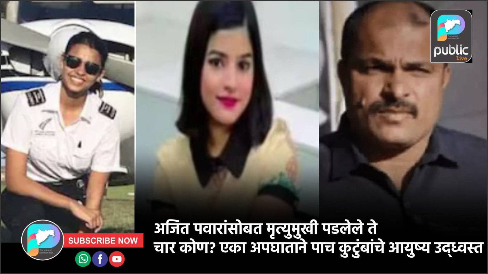 बारामती येथे झालेल्या भीषण विमान अपघातात महाराष्ट्राचे उपमुख्यमंत्री अजित पवार यांच्यासह पाच जणांचा दुर्दैवी मृत्यू झाला. या अपघातात अजित पवार यांचे सहकारी विदीप जाधव, पिंकी माळी तसेच विमानाचे पायलट कॅप्टन सुमित कापूक आणि सह-पायलट शांभवी पाठक यांचा समावेश आहे. अपघात इतका भीषण होता की पाचही जणांचा जागीच मृत्यू झाला. या घटनेमुळे संपूर्ण महाराष्ट्रात शोककळा पसरली असून राज्याच्या राजकारणात मोठी पोकळी निर्माण झाली आहे.